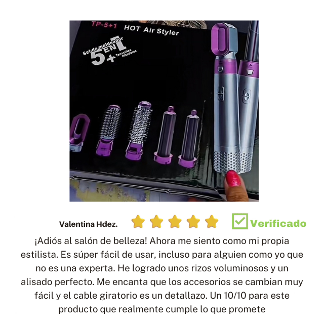 5 en 1 multifunción. Incluye cabezas intercambiables para secar, alisar, rizar, dar forma y agregar volumen, adaptándose a diferentes estilos y necesidades, además de ser adecuado para todos los tipos de cabello. Funciona en cabello lacio, ondulado o rizado, logrando resultados rápidos y uniformes con cada uso.