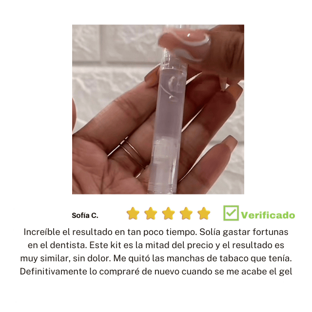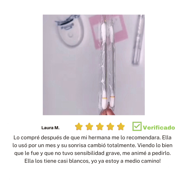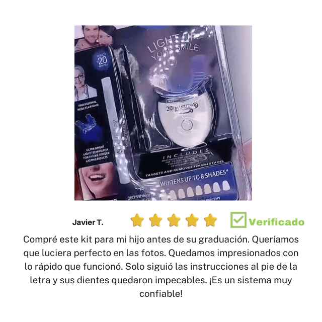 Gracias a nuestra potente fórmula y la acción aceleradora de la luz LED, puedes esperar que tus dientes se blanqueen hasta 8 tonos más claros. Esto significa eliminar años de manchas de café, vino y otros pigmentos, revelando una blancura que no solo verás, sino que los demás notarán al instante.